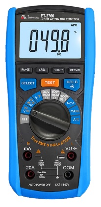 O Modelo ET-2760 é um Multímetro Megômetro capaz de realizar medições de Tensão AC/ DC, Corrente AC/ DC, Resistência, Resistência de Isolação, Capacitância, Frequência, Temperatura, Detecção de Tensão sem Contato (NCV), Duty Cycle, Diodo e Continuidade. Além disso, oferece recursos como Data Hold, Máx/Mín, Relativo e Luz de Fundo que auxiliam na utilização do instrumento. O diferencial do ET-2760 está na função de Teste de Isolação, o instrumento integra um megômetro, possuindo tensão de teste de até 1000V.